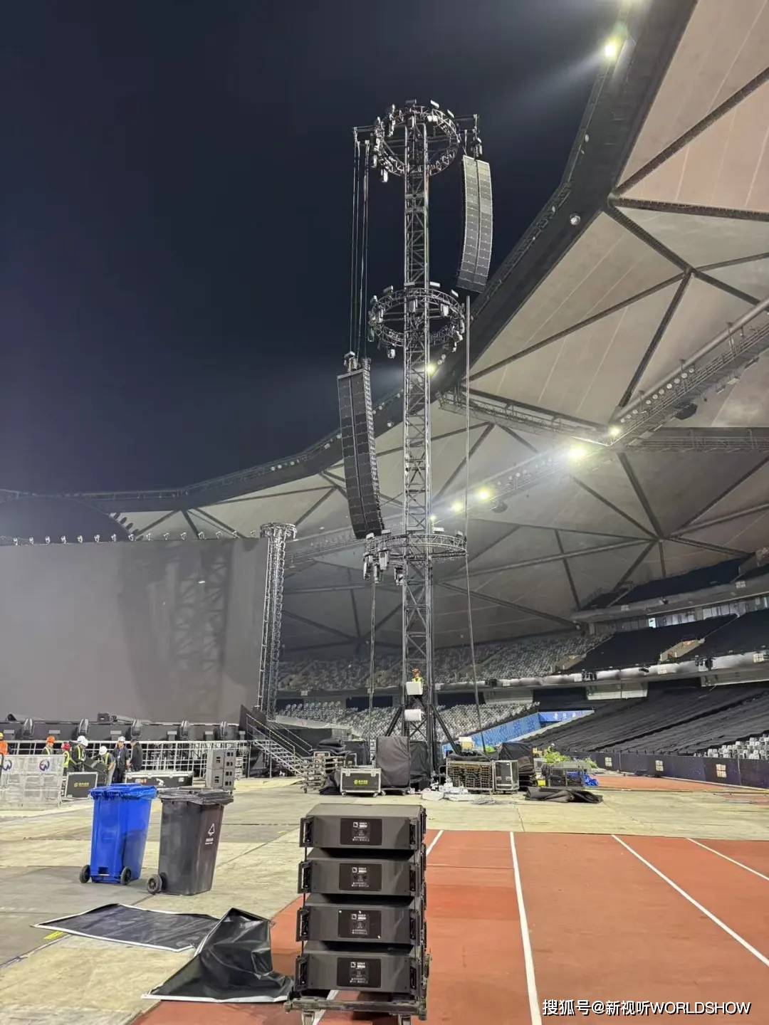 八组灯光塔以前四后四的对称布局环绕舞台与体育场,构建起无死角的立体光场,各展其长又协同联动: